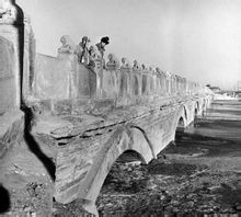 抗战胜利后的卢沟桥1931年11月17日22时,得到补给增援的日军兵分三路,向马部阵地展开狂攻。右翼部队在天野指挥下,从乌诺头出发向新立屯一带左翼阵地进攻。守军吴松林旅虽连战数日疲惫不堪,但面对数倍强敌仍竭死抵抗,打退日军进攻十余此。战至日凌晨,守军战壕多被毁坏,各团、营阵地被切断数十处,难以扼守,遂退往大兴屯一带第二道阵地。17日22时40分,日军左翼部队在长谷指挥下,向汤池一带右翼阵地进攻。守军程志远旅与之殊死奋战。翌日2时,日军增加攻击力量,以坦克8辆、大炮30余门,肆恣猛击,守军难支,遂撤向三间房主阵地。