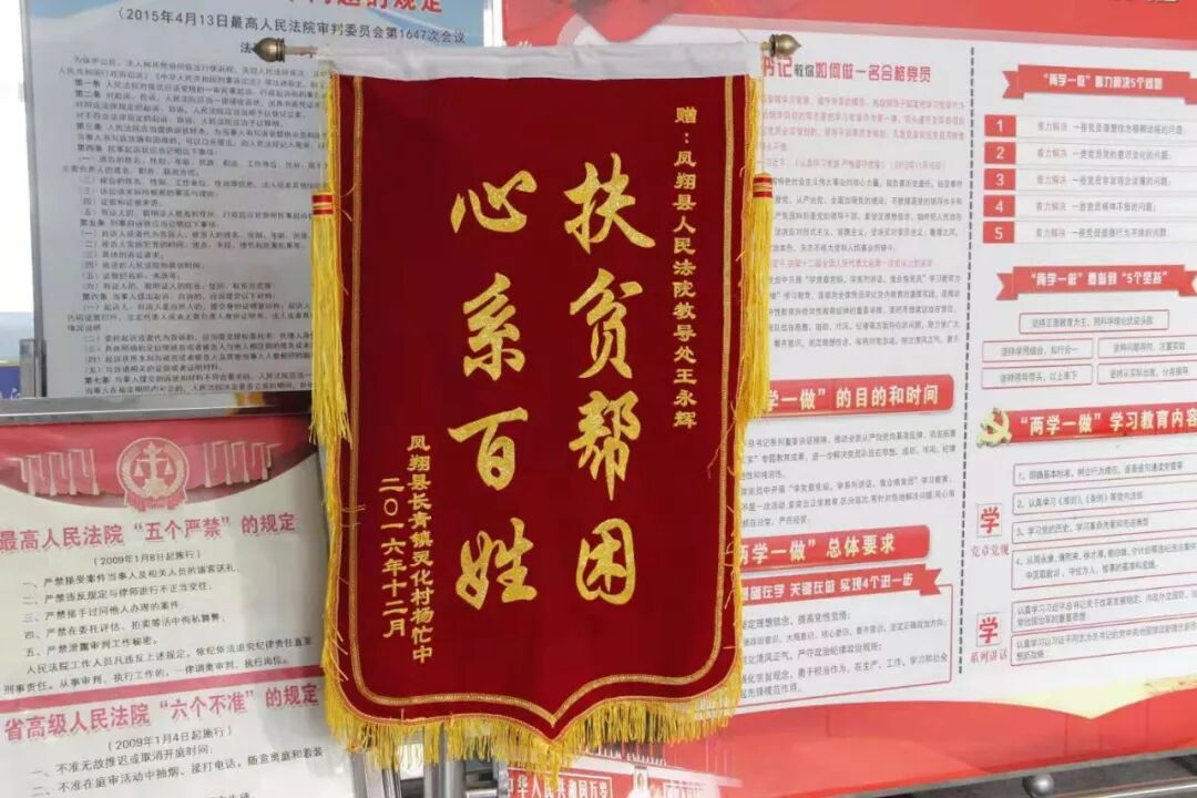 就在新房即将竣工时,杨忙忠母亲突然病故。王永辉得知后,第一时间赶到他家里慰问、帮忙料理老人的身后事,他的行为感动了杨忙忠全家和前来帮忙的村民。杨忙忠全家为了表示感谢,特地到凤翔法院将一面写有“扶贫帮困心系百姓”锦旗递到了王永辉手里。“咱是农村人,也不会说话,只有送上一面锦旗来感谢永辉,感谢他对屋里的帮助。”杨忙忠说到。