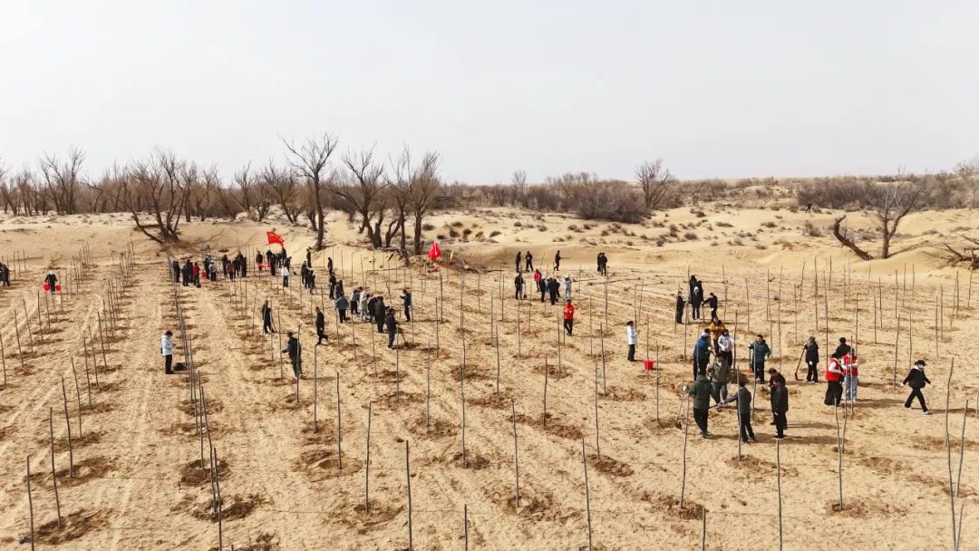 在杭锦后旗乌兰布和沙漠东缘双庙镇继丰村段,植树造林热潮涌动,500余名干部职工挥锹铲土、扶树正苗、培土压实、提桶浇水,每道工序都一丝不苟。经过大家的努力,共栽植新疆杨、沙枣、梭梭、杨柴等各类苗木3万余株,栽植面积达230亩,为改善生态环境贡献自己的力量。干部高泽说,“我们来到沙漠边缘参加义务植树活动,用自己的双手种下一棵棵小树苗,觉得非常有意义。这能让我们增强环境保护的意识,也希望能带动更多的人参与到植树造林活动中。”从一棵树到一片林,大地上的“新绿”正随着春天的脚步蓬勃跳动。杭锦后旗林业和草原局副局长段光硕说,“植树造林,三分种,七分管。我们将持续跟进苗木抚育,通过节水灌溉、病虫害防治等措施巩固造林成果,为美化家园贡献自己的力量。”