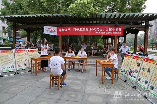 8月4日上午,参加社会实践的浙江工业大学学生,联合虎山街道东门社区学校和西门社区学校,在文化广场开展“衢州有礼,抵制邪教爱祖国,促进和谐谋发展”活动。学生们现场模拟开设法庭,以典型生动的案例,让市民观后受益匪浅。图为模拟开庭情景。