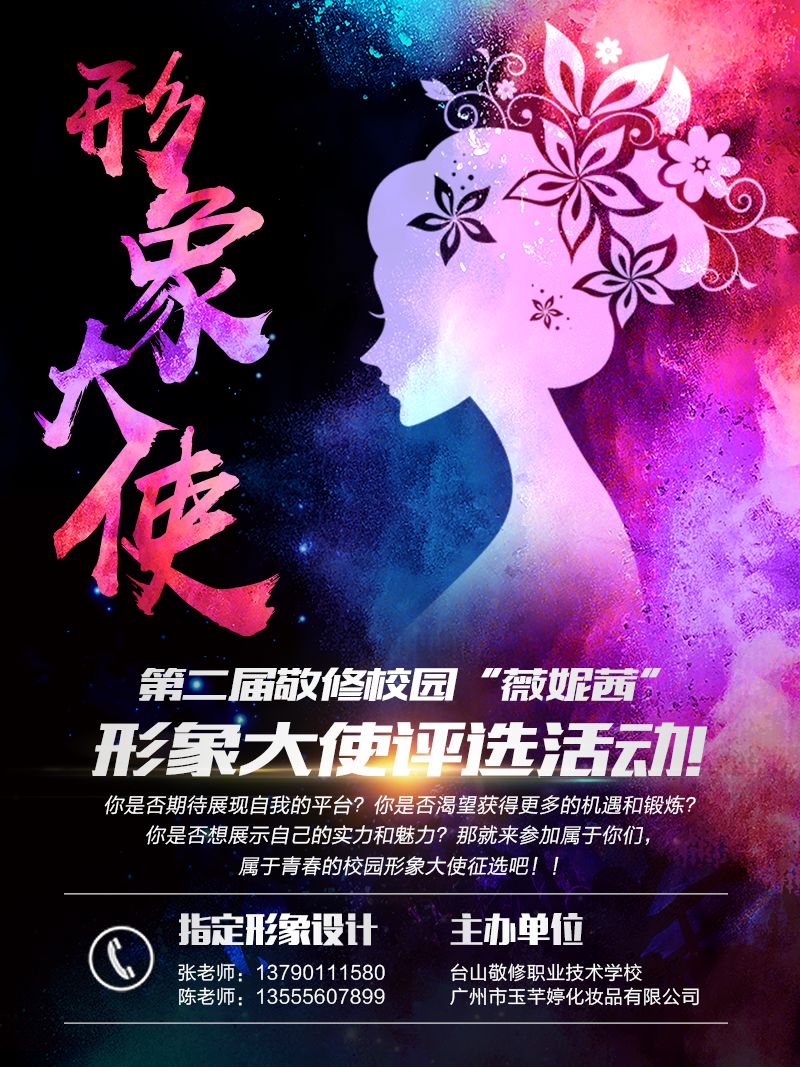 ◆16、17形象设计班全力支持、打造最美校园形象大使,免费为选手提供化妆造型设计。凡参加活动者,通过专业老师及网络投票评选,前10名可获得由广州玉芊婷公司颁发的奖品及证书。