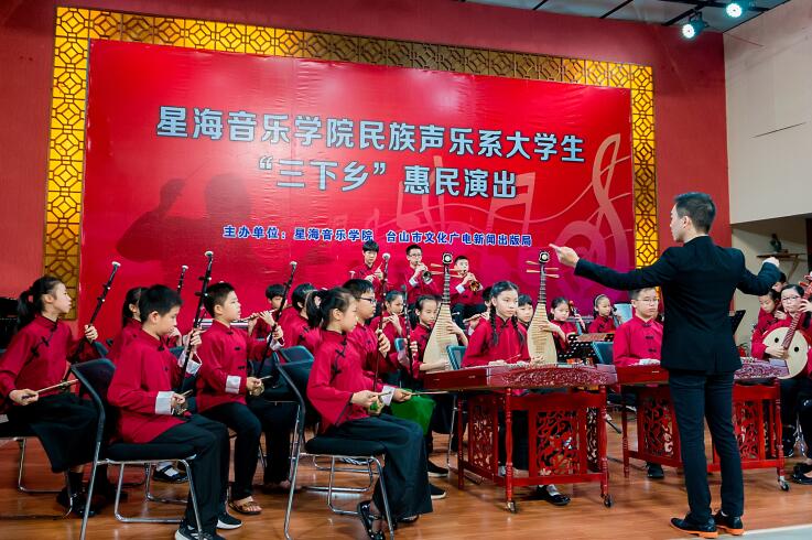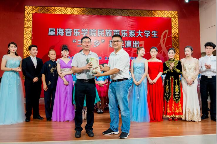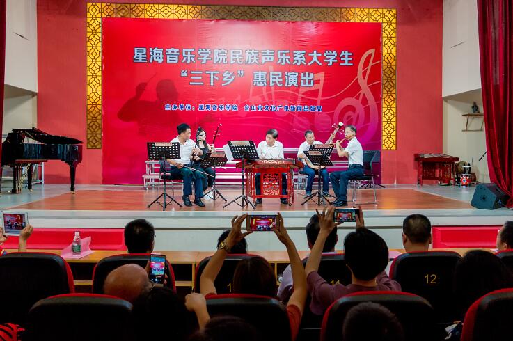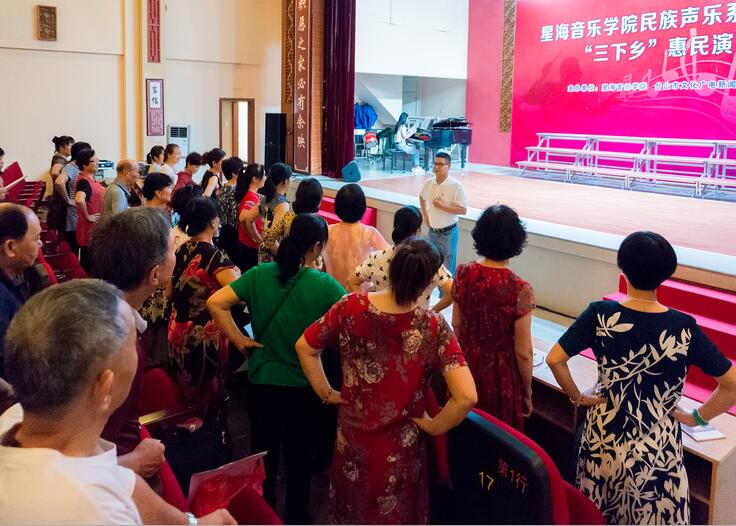 7月3日,星海音乐学院民族声乐系“大学生三下乡”社会实践文化调研团在民族声乐系党支书记杨光的带领下莅临我市进行文化调研。下午调研团前往市文化馆文化活动中心,观看了广东音乐团的演奏并与团员进行交流研讨。同时为我市传经送宝,对台师高级中学二十多位学生和中老年声乐爱好者进行声乐辅导,大家获益良多。当晚,调研团联合我市优秀艺术团体、艺术骨干在市文化馆小剧场举行了一台精彩纷呈的惠民演出。江门市台办主任谭健文,市委书记李惠文,市委常委、常务副市长马品高,市文广新局有关领导和200多位音乐爱好者共同观看了演出。
