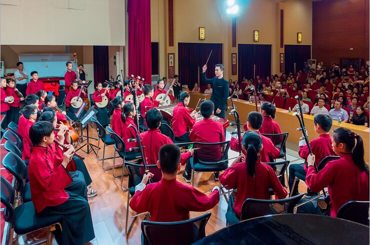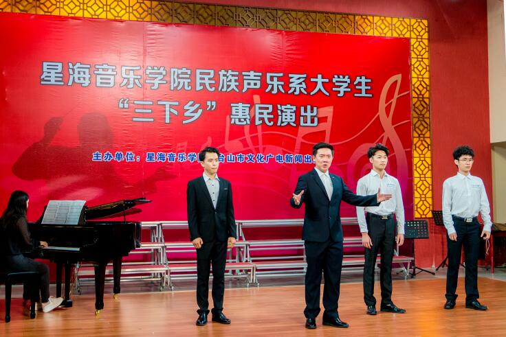 晚上8时,小剧场内座无虚席、掌声雷动,星海音乐学院民族声乐系大学生“三下乡”惠民演出精彩上演。晚会以声乐演唱为主,表演形式丰富,有独唱、小组唱、对唱、合唱、广东音乐演奏等。星海音乐院邹芷婷、郭俊宏、陈海峰等10多位民族声乐系高材生为观众演唱了《荔枝颂》《龙文》《绣红旗》《我爱你中国》《一杯美酒》等彰显新时代风貌的歌曲,首首醉人、曲曲动听,时而婉转悠扬、时而宽广明亮、时而豪情洋溢的歌声泌人心脾、让人陶醉。此外,台山广东音乐团、少儿广东音乐团、市少儿合唱团和优秀歌手各具精彩的演奏和演唱获得了观众热烈的掌声和高度赞赏。整台晚会气氛热烈、高潮迭起,最后在振奋人心的歌曲《不忘初心》中徐徐降下帷幕。