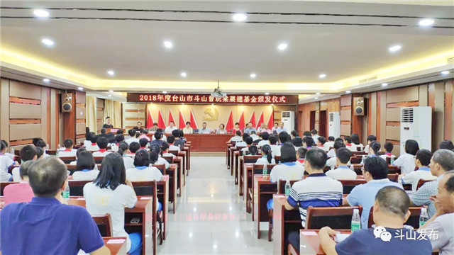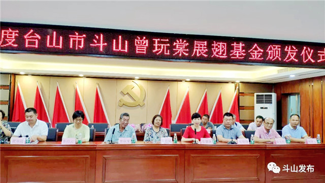 8月19日,2018年台山斗山“曾玩棠展翅基金”颁发仪式在斗山镇人民政府二楼会议室举行。江门市慈善之星、台山市政协常委、澳门台山同乡会会长曾玩棠先生伉俪,台山市委常委李白云、副市长张慧琳,旅港澳乡亲代表,“台山好人”代表,斗山镇党政领导班子与各村(居)支部书记、主任,斗山镇各侨刊负责人,斗山镇中小学校校长,社会各界人士以及受资助和受奖励学生共二百多人参加了仪式。