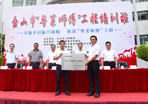 为贯彻落实省委李希书记、江门市委林应武书记对乡村振兴、精准扶贫工作的指示精神,台山市委、市政府大力实施“粤菜师傅”工程。8月1日,江门首个“粤菜师傅”培训基地在台山市广东厨艺技工学校正式挂牌开班培训,江门市副市长梁许赞,台山市委副书记、市长谢少谋,副市长亓光勇以及江门、台山相关部门负责人出席挂牌仪式。
