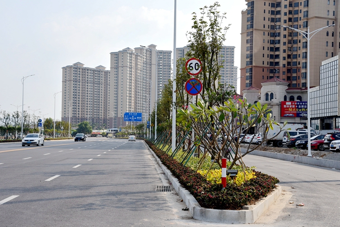 日前,记者来到舜德路至四九路口路段,见到整个路段交通秩序良好,绿化带上植被郁郁葱葱。新铺设的主车道为双向6车道,两旁各2车道的辅道及人行道,总宽60米,大大方便了城区到四九的交通来往。道路两侧、环岛等处种植品种丰富的树木、绿植、花卉,让道路本身成为一道“绿色长廊”。