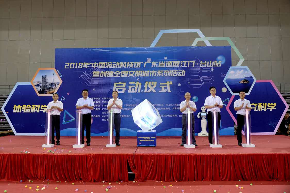 今天上午10时,在中国科学技术协会和中国科技馆指导支持下,由广东省科学技术协会、广东省科技厅、江门市科学技术协会、台山市人民政府主办,广东科学馆、台山市科工商务局、台山市教育局、共青团台山市委员会和台山市科学技术协会等单位承办的“中国流动科技馆”广东省巡展江门台山站暨创建全国文明城市系列活动在新宁体育馆隆重举行启动仪式。广东省科协党组成员、副主席吴焕泉同志、广东科学馆馆长何少强同志、广东科学馆副馆长张碧华同志、江门市科协主席吴森同志和台山市副市长赵智健同志等领导和嘉宾出席了仪式。我市全民科学素质纲要实施工作办公室成员单位代表,市直部门和镇(街)领导,台山市中小学师生代表共800多人出席启动仪式。