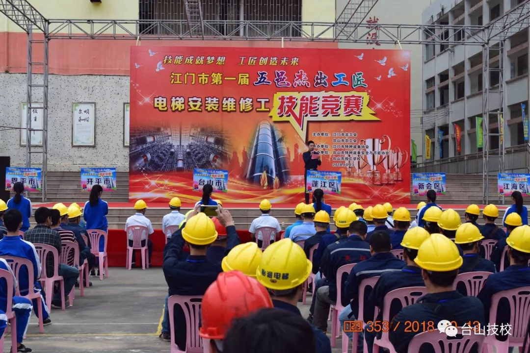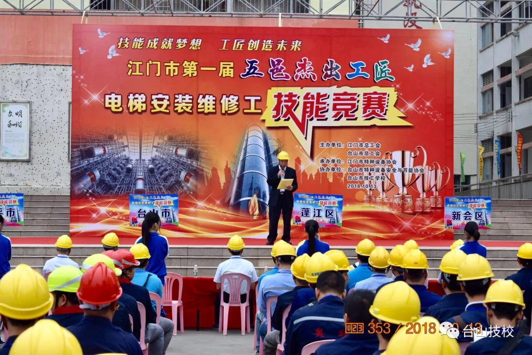 为贯彻落实党的十九大提出的“建设知识型、技能型、创新型劳动者大军,弘扬劳模精神和工匠精神,营造“劳动光荣的社会风尚和精益求精的敬业风气”精神,进一步壮大五邑地区技能人才队伍, 2018年10月13日在台山市技工学校举办了首届“五邑杰出工匠”( 电梯安装维修工)技能竞赛。本次比赛由江门市总工会、台山市总工会主办,由江门市特种设备协会承办,台山市特种设备安全与节能协会及台山市技工学校协办。