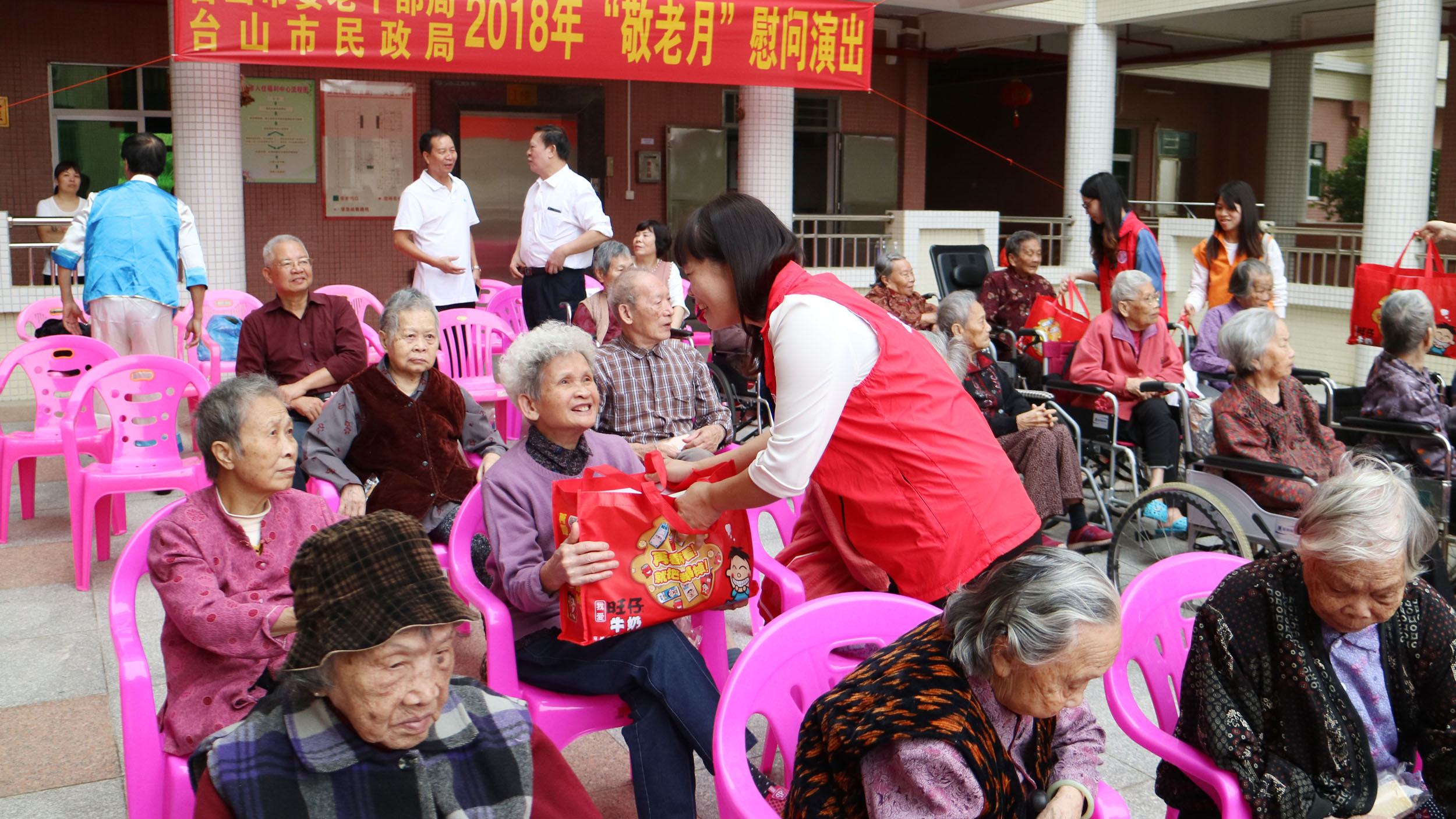 10月16日,台山市民政局老龄办联合市委老干部局,走访慰问台山市社会福利院老人们,给他们送温暖、献爱心,送上慰问礼品。市老干部活动中心文艺团为他们献上了一场精彩文艺表演,使在院的老人们在欢声笑语中度过一个愉快的下午,表演受到老人们的一致称赞和好评。