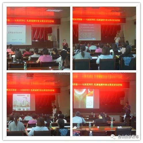 随后,台山市妇幼保健院乳腺病防治中心团队为妇女代表们开展“与美丽同行·乳腺健康科普全国巡讲白沙站”讲座。会上,台山市妇幼保健院保健股股长关红瑛主任就如何防治宫颈癌、台山市妇幼保健院综合科(乳腺病防治中心)负责人廖纯榜主任就如何防治乳腺常见病多发病、台山市妇幼保健院妇科负责人蔡伟卿主任就如何防治阴道异常流血、台山市妇幼保健院优生优育科盘根明副主任就生殖、环境、优生分别进行宣讲。