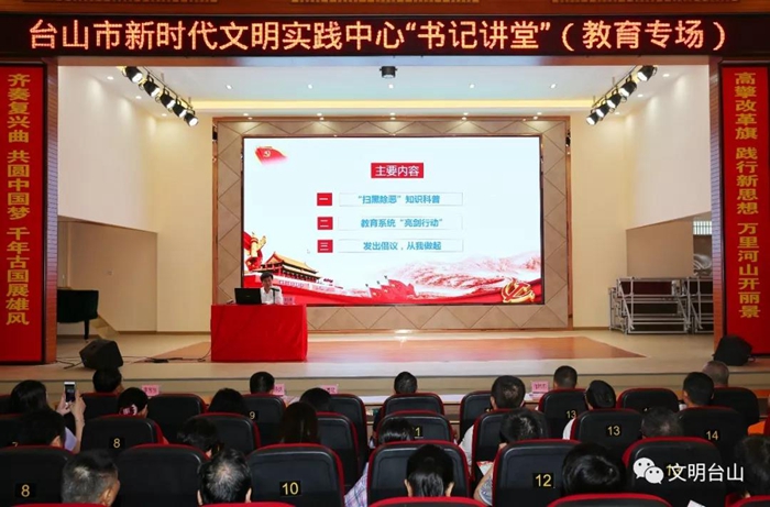 市教育局局长李石凑在党课中指出,新时代贯彻党的教育方针,要贯彻习近平新时代中国特色社会主义思想,坚持社会主义办学方向,落实立德树人的根本任务,坚持教育为人民服务,同生产劳动和社会实践相结合,加快推进教育现代化、建设教育强国、办好人民满意的教育,努力培养担当民族复兴大任的时代新人,培养德智体美劳全面发展的社会主义建设者和接班人。主讲人还结合教育系统实际,讲述了教育系统扫黑除恶十类打击重点,并结合《广东省教育厅关于开展教育系统行业治乱专项治理行动》向全市教育系统发出倡议,要求全市教育工作者认真学习,增强思想自觉和行动自觉,积极参与到这场扫黑除恶人民战争中,守护好台山教育的净土!