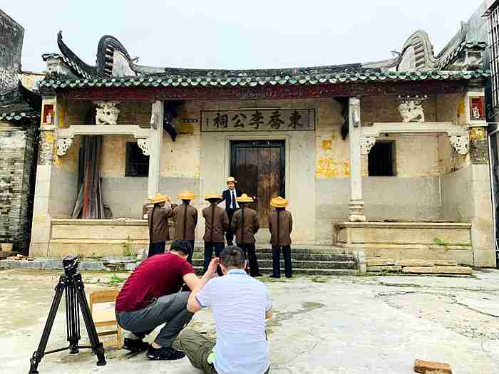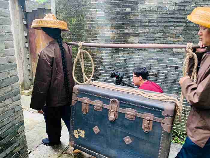 4月17日上午,大江镇水楼村一改往常地热闹了起来,演员们穿着棕色唐装、扎着长辫、戴着竹帽,抬着金山箱在村道里来来往往。有趣的拍摄场景,吸引了不少村民围观。