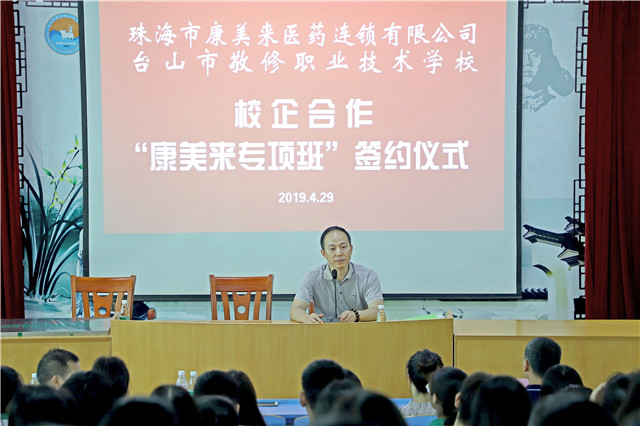 4月29日,敬修职业技术学校与珠海市康美来医药连锁有限公司签约合办康美来专项班,签约仪式在学校阶梯室举行。教育局职成办负责人朱毅夫、康美来医药连锁有限公司董事长苏韦锟及学校领导、药剂专业师生等参加活动。
