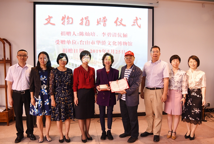 据悉,陈灿培博士祖籍广东番禺,澳门出生,台山女婿,是知名美籍华人收藏家,现为美国飞虎队研究院院长,台山市博物馆终身顾问,同时也是中国五个城市的荣誉市民。多年来,陈博士致力为搜集华侨文物倾注了大量精力和财力,他积极联络海外侨胞并将分散在海外的华侨文物带回祖国捐赠给各地博物馆,为促进中外文化交流做出了贡献。今年,当陈博士伉俪得知我市筹建华侨文化博物馆,他们便决定再次捐赠珍贵的华侨实物给我市。台山市华侨文化博物馆预计于今年年底建成使用,博物馆将打造成广东省华侨文化展示教育基地、青少年爱国主义教育平台、海内外乡亲沟通的桥梁和纽带,以此宣传、弘扬华侨艰苦奋斗的历史往事,恋祖念根的家国情怀。(图/许丽莺)
