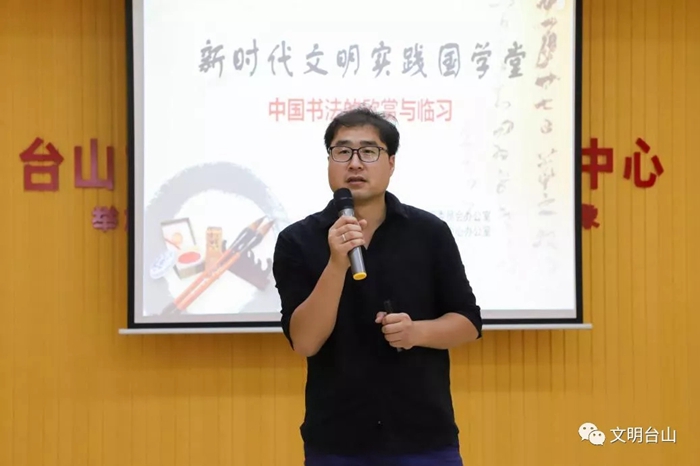 本次课堂邀请了台山市华侨中学教师、台山市侨中嶨基山书社指导老师巩军鹏进行授课,受到全体师生的热烈欢迎和肯定。巩军鹏讲师以生动幽默、富有激情的语言讲述了自己从初入书法创作之路、追求书法的路上遇到了种种引人入胜的故事。他说,学习书法有利于提高一个人在艺术方面的审美能力。