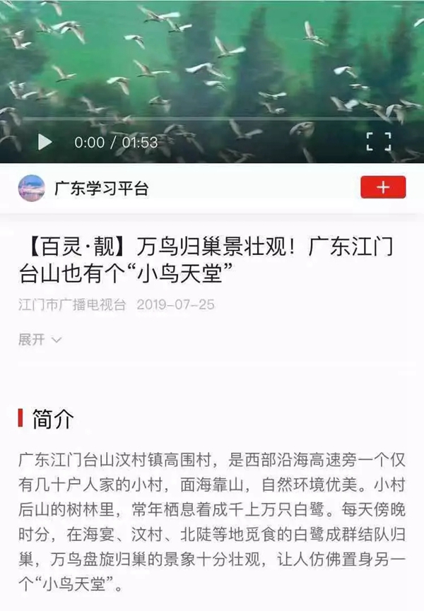 最近,汶村镇高围村登上了“学习强国”平台!村里环境优美,还有成千上万的白鹭,台山版的“小鸟天堂”,十分壮观!