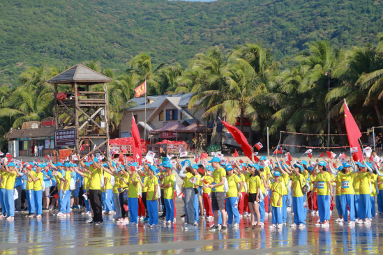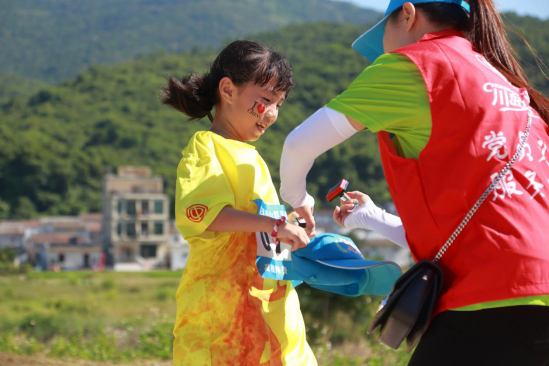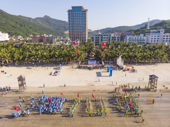 活动开始前,参赛者们联合下川中学学生在王府洲沙滩进行了快闪活动,伴随着《我爱你,中国》的悠扬歌声,学生们迅速排列成“70”的字样,大家共同挥舞着国旗,大声唱出对祖国最真诚的爱和最美好的祝愿。