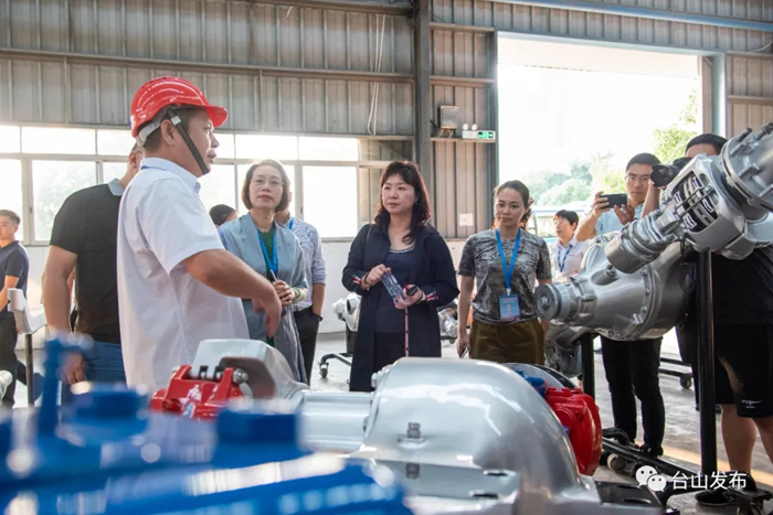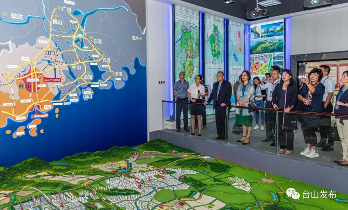 在工业新城展厅内,全球商报联盟媒体观看了《川海奔流·天下台山》宣传片,通过和讲解员的互动,详细了解台山的基本情况以及工业新城的规划、生产以及招商引资等情况。随后,他们还深入富通达公司、富华重工和伍炳亮黄花梨艺博馆实地采访。