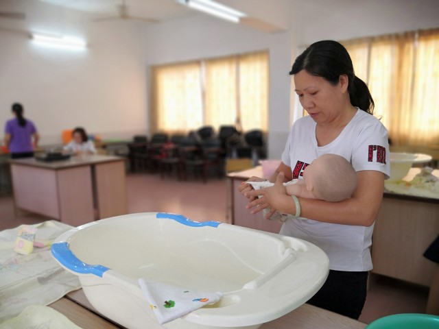 育婴师培训学员关惠娜说,她在平时课程主要学习育婴员的内容,怎么给婴儿洗澡、穿衣、洗奶嘴,和婴儿玩游戏等。她现在在幼儿园工作,这对她照顾孩子有大的帮助。