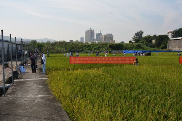 11月1日上午,市农业农村局组织举办台山市2018年度基层农技推广体系补助项目晚造品种现场观摩会。主会场设在市农科所水稻科研基地,市农业农村局、市农业技术推广中心、市科学技术协会、江门天禾农业服务有限公司、江门市植保科技有限公司台山分公司、各镇(街)农办、市基层农技推广体系补助项目全体水稻技术推广员以及各镇水稻科技示范户等130多人参加了本次观摩会。