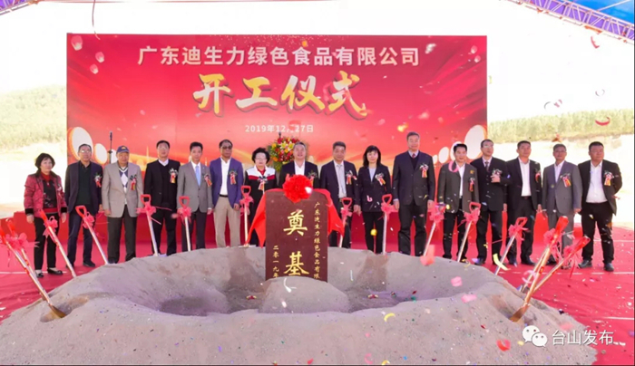 12月27日上午,广东迪生力绿色食品项目在斗山镇聚龙工业园奠基开工。省政府参事、省侨联原主席王荣宝,江门市政府副秘书长梁富鸣及我市领导李惠文、李健慈、方健康等参加奠基活动。