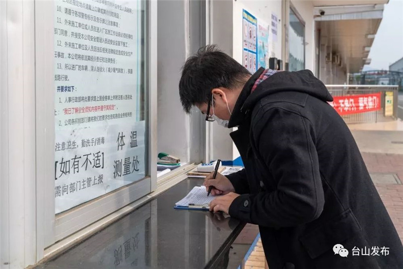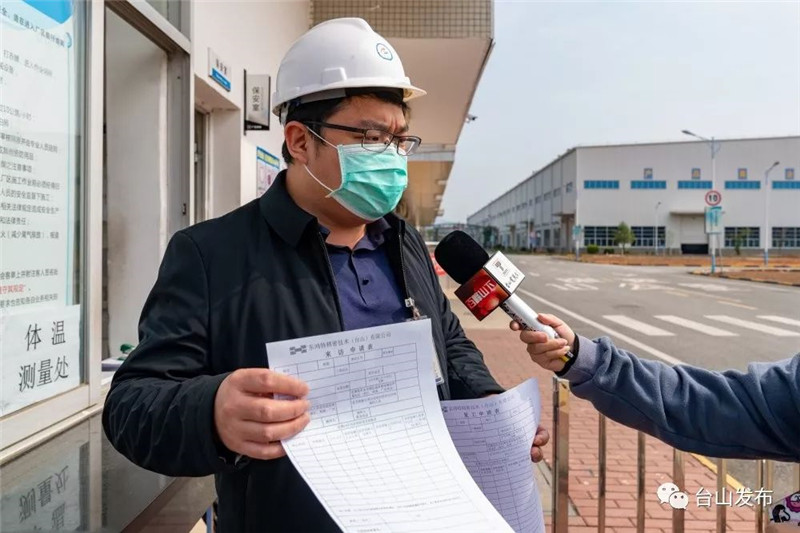 在入厂登记处,公司质量部部长伍德良告诉记者,他们有两张调查表,一张给公司员工,一张给外来人员。两张表内容大致一样,主要调查有没有去过疫区,有没有接触过疫区的人员或病例亲密接触者,在14天内的行踪,乘坐过哪些交通工具。员工和外来人员需提前把情况填到表上并发给公司,公司安排专人审核,核实没有风险后,才通知员工和外来人员可以来访或到公司复工上班。在抵达厂区门口时,任何人员都要接受体温检查,接受戴口罩、洗手培训后,才允许进入厂区。