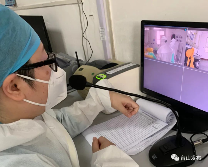 通道班有几个老师在上,分别有监督穿防护服,有监督脱防护服,补充物质的。第一天上班就遇上了3楼“关通道大吉”,所以3楼的队员们都在4楼穿、脱防护服,加上一共3个病区不同的上下班时间,一批穿完防护服,最少是两小时的事情,相对来说,在监督脱防护服下班的老师,也得看着监控2小时!大家都把“天使守护者”的工作做到最好!