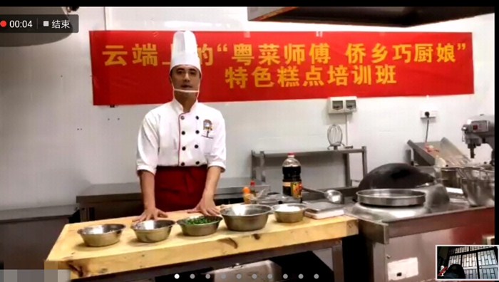 培训班采取线上视频教学方式,利用实时远程网络会议软件,实现“零接触”、“不聚集”上课,让学员“宅在家”便能学到技能,切实做好防控和培训“两不误”。培训采取理论与实操相结合的方式,在开课前,台山市厨艺学校的工作人员及时将食材分批打包配送到学员手中,保障教学顺利开展。厨艺学校的专业老师从职业道德、糕点原材料及工具设备的使用、工艺流程、操作手法等方面进行授课,并展示了糯米糍、馒头、花卷、韭菜煎饺等传统粤式糕点的制作过程,学员们则打开网络视频软件跟随老师的讲解边学边做。