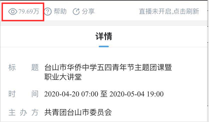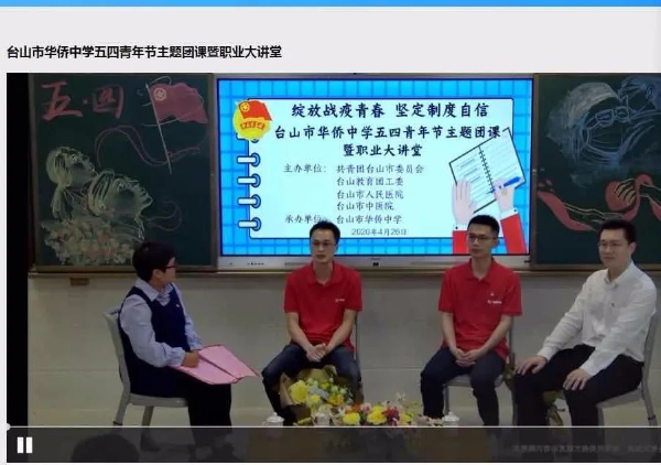 4月26日,团市委联合市教育团工委及市人民医院、市中医院,在台山侨中开展“绽放战疫青春,坚定制度自信”五四青年节团课直播。台山市援鄂医疗队队长甄新现、队员李振宏与团市委书记谢永斌进行面对面访谈,分享战“疫”经历,畅谈青春成长。灵活直观的网上直播获得全市各级团组织团员青年的欢迎,最高峰值达到79.69万人次在线进行了收看。