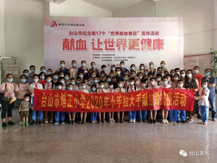 6月20日,台城地区18所学校,600多名学生和家长分批来到市红十字会献血中心,在工作人员的指引下,签到、量体温、测血压。学生家长手拉手一起参与无偿献血,并合影留念,工作人员还为小朋友们赠送了小礼品,场面温馨热闹。现场的小孩子都大赞爸爸妈妈很勇敢,是他们心中的榜样。培正小学家长李勇表示,自己已经是连续三年参加这种活动,想借着机会多为社会做些公益,同时也能对自己的孩子起到好的教育作用。本次活动成功献血人数223人,献血量51600毫升。