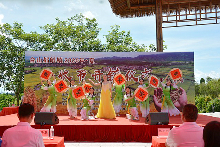 活动现场还举行了歌舞表演、平价农产品销售等活动,吸引众多游客、群众前来参与。活动期间,在场领导嘉宾共同为台山中国农业公园禾海稻浪农渔文体旅融合试验项目揭牌,为早稻收割开镰。