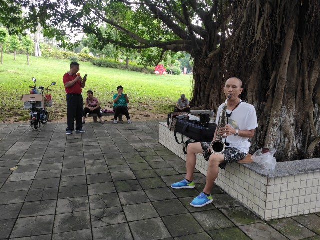 在公园的角落,退休的袁先生是这里的“常客”。他弹奏萨克斯已有1年多的时间,现在几乎每天早上都会过来和其他爱好音乐的朋友一起度过快乐的演奏时间。他表示,在这里演奏不会影响到邻居,环境也很好。