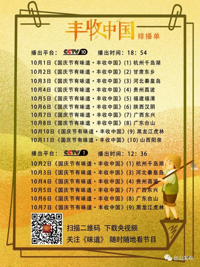央视在台山拍摄的美食纪录片纪录片正式定档在《国庆节有味道·丰收中国》栏目上演!具体频道和时间如下:央视CCTV-1综合频道10月6日中午12:36、央视CCTV-10科教频道10月8日晚上18:54,上演45分钟台山专场。节目向世界介绍台山青蟹、海宴莲藕、上川石硖饭,还有在汶村举行的“开渔节”等!精彩内容不容错过!