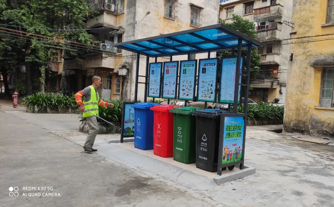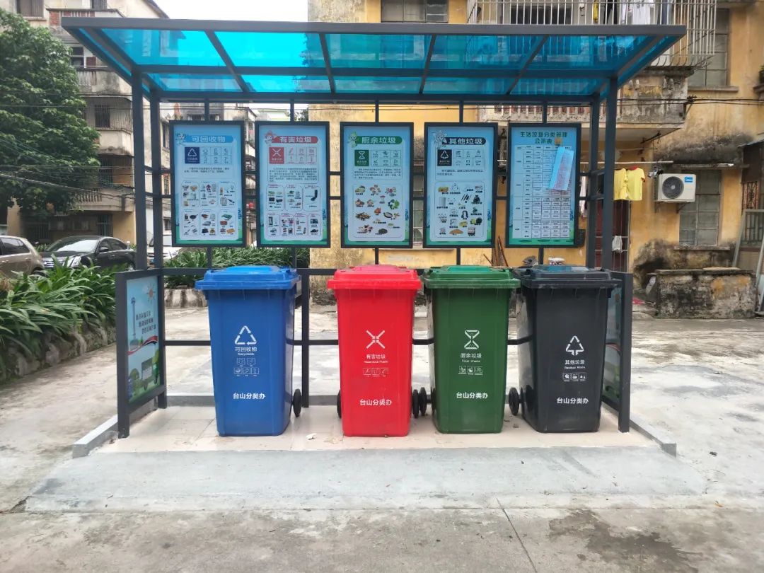 在台城南门路一带的旧小区里,环卫工作人员为方便居民自己拎垃圾下楼投放,在每一栋楼的楼梯口处都新增了有上盖的便民垃圾收集桶,环卫收集车每天将这些垃圾桶收集的垃圾集中回收到垃圾中转站进行分类处理。而在小区周边,我局按照《广东省城市生活垃圾分类投放与收集设置指引》,专门配备建设了3个生活垃圾四分类投放亭,每一个投放亭都配有醒目的新国标图案,指导群众按可回收垃圾、有害垃圾、厨余垃圾和其他垃圾进行分类投放,并配备有240升的密闭收集容器,方便市民按需投放。