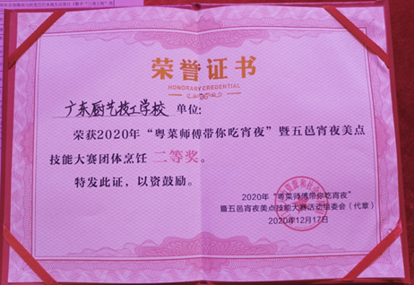 此次活动台山市精心准备,派出广东厨艺技工学校学员代表参赛,“粤菜师傅”学员们赛前刻苦训练,在竞赛中团结一心、精心制作,代表单位广东厨艺技工学校荣获2020年“粤菜师傅带你吃宵夜”暨五邑宵夜美点技能大赛团体烹饪二等奖。另外在专业项目竞赛中,学员成其庞获得了中式烹调三等奖、伍伟雄获优胜奖;学员黄燕燕获中式面点优胜奖。