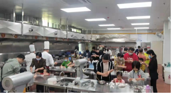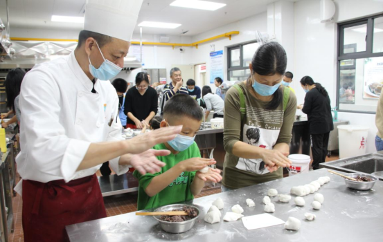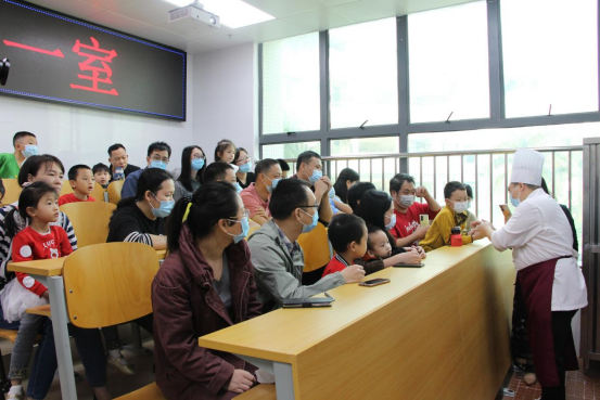 在厨艺学校“粤菜师傅”综合培训楼的三、四楼实操教室,来自台山市人社局的20个亲子家庭井然有序的坐在阶梯教室的课桌前,一些“小人社成员”们翘首以盼期待着面点制作体验课程的开始。