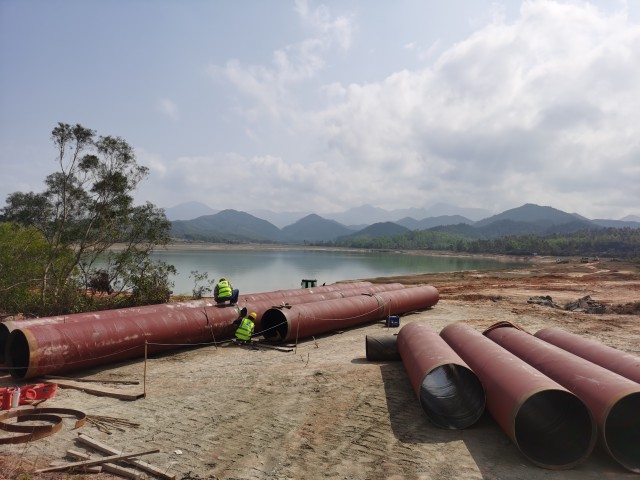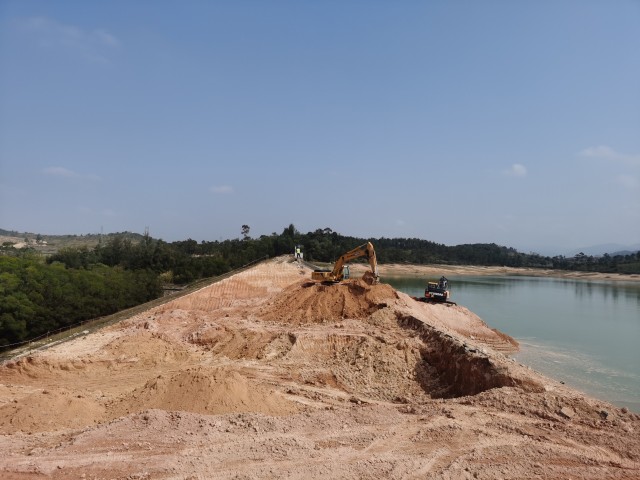 在台山冲蒌镇山耳水库主坝,挖掘机、推土机、重型货车正在忙碌地施工,围堰完成近半,主大坝挖开一个缺口,预计近期将安装输水涵管。在副坝,溢洪道主体工程基本完成,输水涵管已经埋好,工程机械正在进行泥土回填的收尾工作。